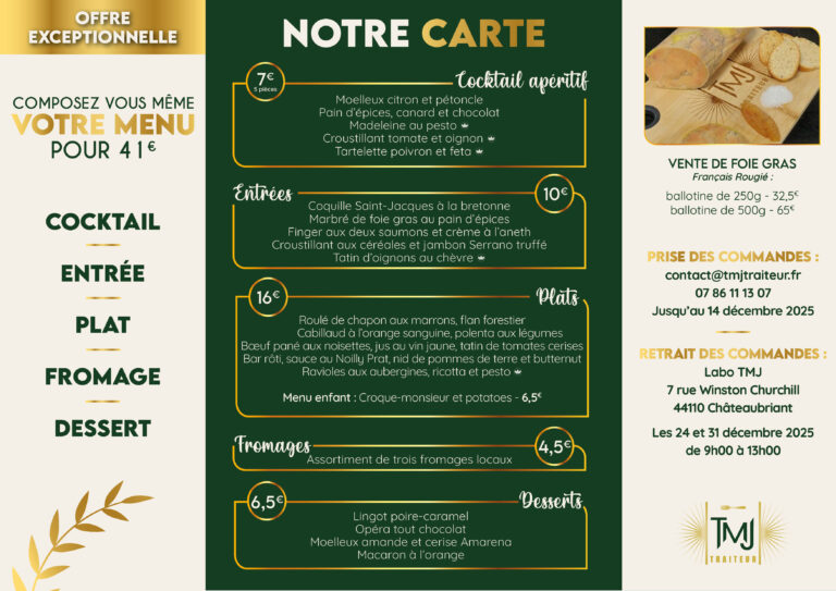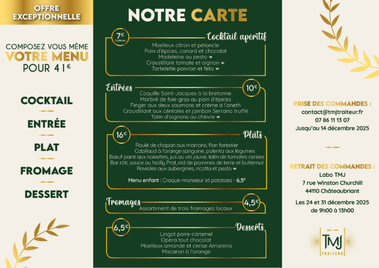 Chez TMJ Traiteur, nous avons à cœur de rendre vos fêtes de fin d’année inoubliables avec une carte spécialement imaginée pour l’occasion.